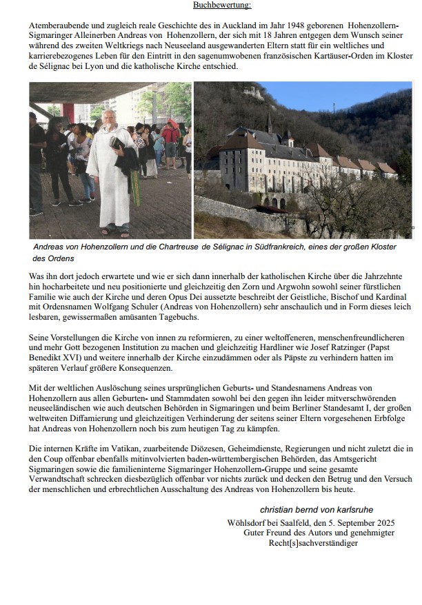 Atemberaubende und zugleich reale Geschichte des in Auckland im Jahr 1948 geborenen Hohenzollern-Sigmaringer Alleinerben Andreas von Hohenzollern, der sich mit 18 Jahren entgegen dem Wunsch seiner während des zweiten Weltkriegs nach Neuseeland ausgewanderten Eltern statt für ein weltliches und karrierebezogenes Leben für den Eintritt in den sagenumwobenen französischen Kartäuser-Orden im Kloster de Sélignac bei Lyon und die katholische Kirche entschied.