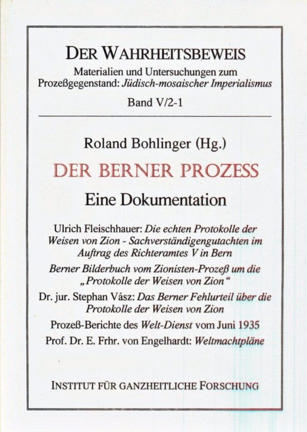 Tags: Berner Prozess, Binjamin Segel, Dokumentation, Dr. jur. Stephan Vász, Gegenschrift, Geheimnisse, Gottfried zur Beek, Kader, Kritisch, Prof. Dr. E. Frhr. von Engelhardt, Roland Bohlinger, Ulrich Fleischhauer, Weisen von Zion, Welt-Dienst, Weltmachtpläne
